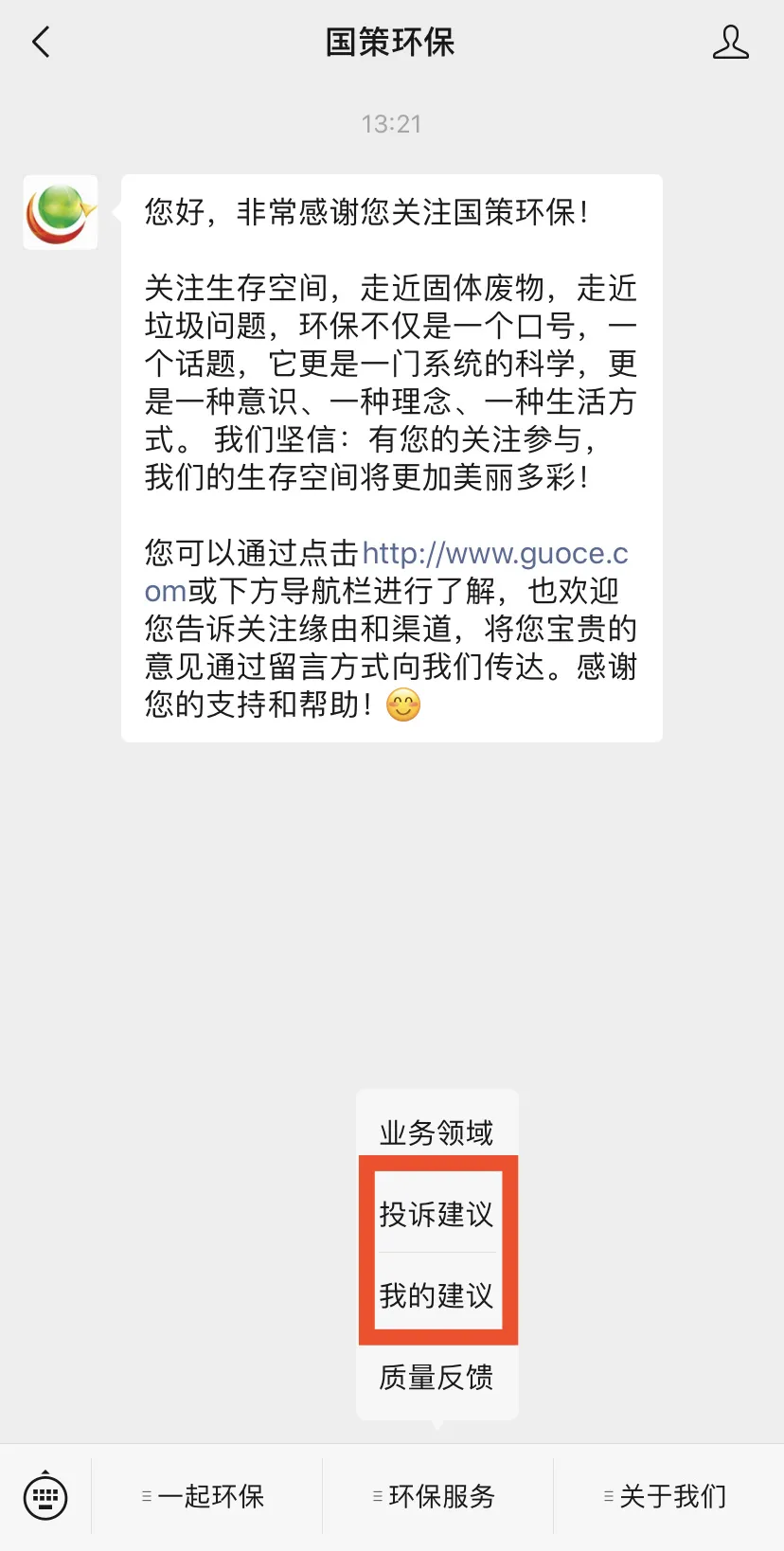 同時,社會公眾可通過關注國策環(huán)保微信公眾號,對國策環(huán)保運營項目的環(huán)衛(wèi)質量和服務水平提出意見和建議,對保潔不到位、清運不及時的路段或點位拍照上傳,反饋到云平臺,國策環(huán)保將根據(jù)處理進度,推送處理結果,達到社會共治的創(chuàng)舉。